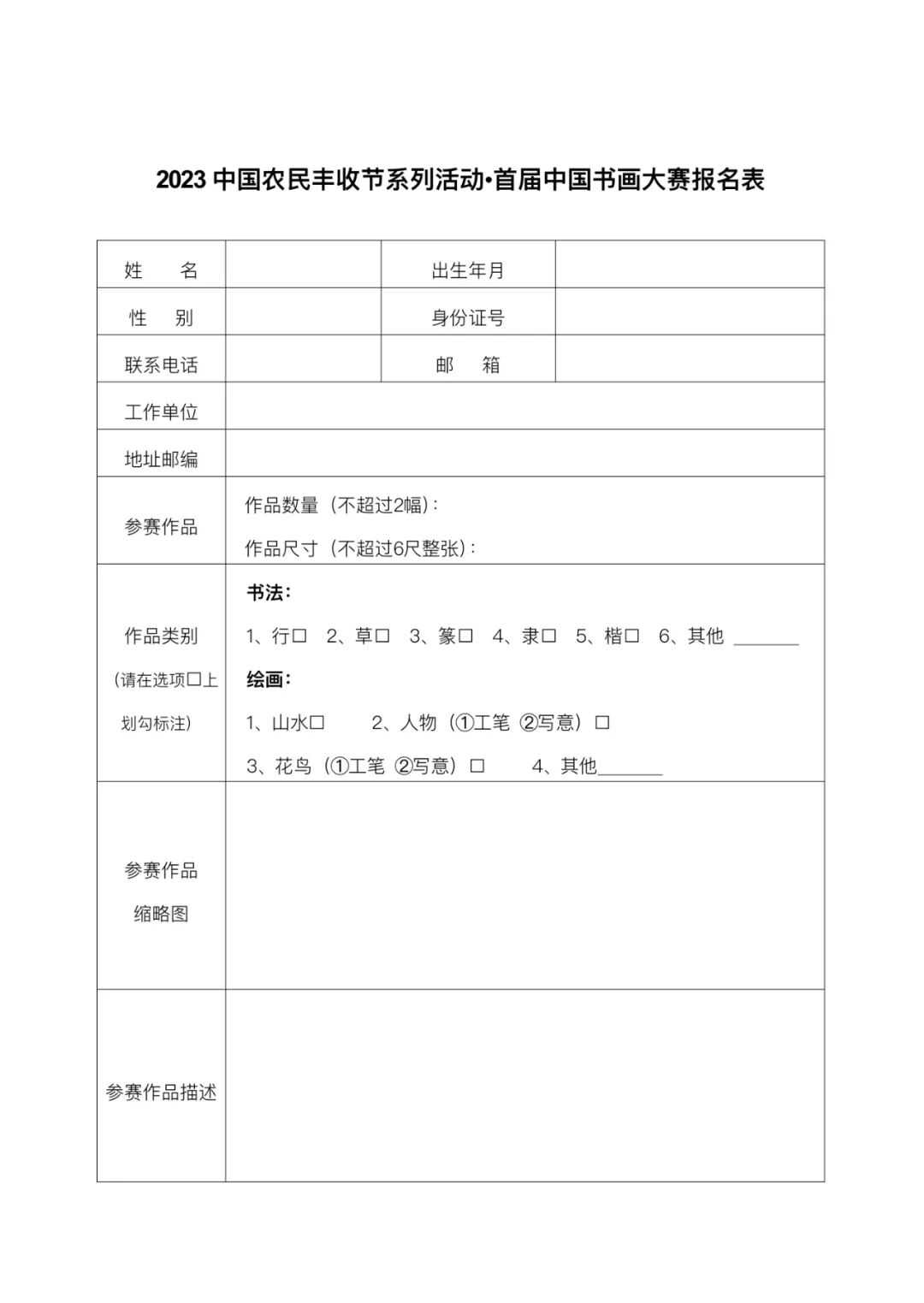 一、活动名称  2023中国农民丰收节系列活动·首届中国乡村书画大赛  二、活动目的  以书画培元,弘扬传统文化。以书画铸魂,描绘锦绣河山。以书画弘业,造福乡村居民。以书画立心,助力乡村振兴。  举办中国乡村书画大赛,围绕乡村书画产业发展,增强农民书画创作能力,增长农民书画知识,提高农民书画鉴赏水平,助力艺术引领乡村共富。同时,吸引众多农民书画爱好者、社会各界书画爱好者一起“书乡村、画乡村”,讴歌新乡村,讴歌新时代。  三、时间地点  时间:2023年10月初-12月初  地点:江苏省靖江市  四、活动主题  丹青绘就丰收卷,翰墨讴歌和美村  五、组织机构  (一)指导单位  中国农民丰收节组织指导委员会办公室  农业农村部农村社会事业促进司  农业农村部乡村产业发展司  江苏省农业农村厅  (二)组织单位  主办单位:  中国乡村发展协会  联合主办单位:  中国农业电影电视中心  农民日报社  中国农业出版社  中国农村杂志社  中共靖江市委员会  靖江市人民政府  (三)承办单位  中国乡村发展协会乡村文化振兴委员会  中共靖江市委宣传部  靖江市农业农村局  靖江市文体广电和旅游局  靖江市融媒体中心  靖江市文联  北京数字华域咨询有限公司  (四)大赛组委会  大赛成立组委会,设置组委会办公室,由相关单位专家组成,负责大赛总体策划、方案制定、组织协调、媒体宣传、承办单位沟通。同时设首届中国乡村书画大赛评审专家委员会,邀请来自书画行业有影响力的10位专家组成。评审规则和标准由首届中国乡村书画大赛评审专家委员会制定。  六、参赛对象  农民书画爱好者、社会各界书画爱好者。  七、奖项设置  (一)作品奖项  一等奖6名+奖金各10000元+证书  二等奖10名+奖金各5000元+证书  三等奖20名+奖金各3000元+证书  优秀奖200名+证书  (二)获奖作品将公示五天,主动接受社会监督  (三)所有获奖作品均参加展览  (四)最终解释权归2023首届中国乡村书画大赛组委会  八、作品要求  (一)参赛作品要符合党的各项方针政策,符合社会主义核心价值观,符合国家法律法规要求,符合各民族传统文化和风俗习惯;  (二)选题内容要围绕“庆丰收 促和美”主题创作,选题思路要以反映农民的精神风貌、讴歌农业的蓬勃发展、展现农村的巨大变化为主,作品要弘扬主旋律,传递正能量,并具有一定的人文思想内涵和较强的艺术表现力;  (三)参赛书法作品仅限毛笔书法,书体不限。参赛画种包括中国画、油画、版画、水彩(水粉)和农民画等。书法作品和绘画作品的评选入围比例为1:1;  (四)参赛作品一律为作者原创作品,严禁使用高仿、抄袭他人、复制自己作品参赛,否则造成任何法律纠纷或责任由作者自负,并取消其参赛资格;  (五)初赛作品只接收JPEG格式的电子文件,单幅文件大小不低于5M,每人最多投2幅作品。入围作品均需邮寄,请在作品背面右下方用铅笔正楷注明:作者真实姓名、年龄、性别、身份证号码、联系电话、详细通讯地址、作品类别等。为了防止邮寄中破损遗失,作品需妥善包装并进行保价;  (六)入围作品必须为原件,作品尺寸最大为竖幅/横幅6尺整张(96*178cm),最小为斗方(69*69cm),无需装裱。为便于评审、装裱和展示,入围作品应选择高质量专业书画用纸,避免使用易折断、破损的纸张;  (七)为便于大赛的宣传,请入围作品拍摄创作过程中的视频或者照片以及祝福语发至投稿邮箱。视频格式为MP4,照片格式为JPEG;  (八)本次活动免收参赛费。入围作品一经寄出概不退换,获奖作品由主办方收藏,主办方对所有来稿有展览、出版、宣传等处置权。  九、赛程设置  活动将分为征集、初评、终评、颁奖四个阶段。  (一)征集  征集时间:截至11月25日  征集方式:关注官方微信、微博等平台,线上报名提交。  (二)初评  初评时间:11月28日  初评要求:内容符合征集作品要求,积极向上;页面排版工整、合理。  (三)终评  终评时间:11月30日  终评要求:书法作品以笔画流畅、明亮度高、力量感强、分布匀称为评审标准;绘画以作品传播价值、色彩搭配合理、内容新颖富有创意等为评审标准(参照评审规则执行)。  (四)颁奖  活动时间:12月9日  邀请嘉宾:所有获奖作者、全国各界书画专业人员及爱好者、书画名家、政府领导、企业家代表、媒体代表等出席。  十、联系方式  联 系 人:窦庆林18910777279  朱美哲18910761115  投稿邮箱:xcwhzxwyh@126.com